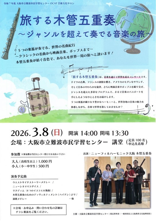 2014年 5月 17日(土) 14時開演 OCAT大阪市民生涯学習センターにて、 ニューフィルハーモニック大阪木管五重奏の「アフタヌーンコンサート〜木管五重奏とピアノの愉しみ〜」 |